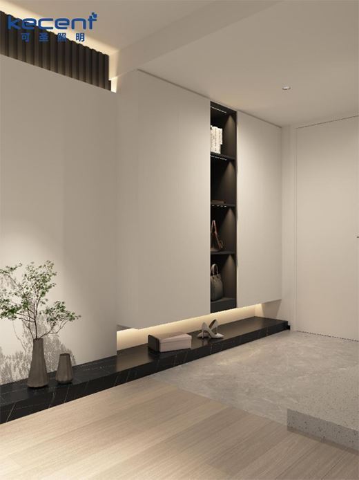 玄關柜底部安裝常規明裝線性燈,不僅能照亮柜底位置,方便日常拿放鞋子,同時助力原本厚重的玄關柜營造出“懸浮”效果,輕盈感讓人欣喜。