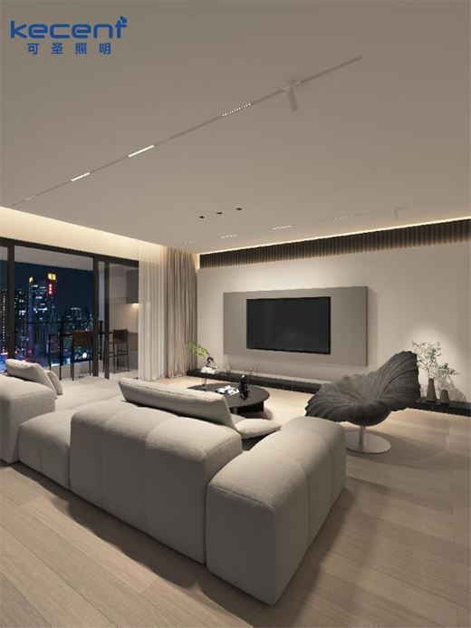 從玄關與琴房延伸而出,便到了客廳區域。寬敞的客廳,自然要搭配上明亮的燈光環境。客廳吊頂中央安裝三盞嵌入式防眩射燈,重點提亮茶幾區域,閑暇時光泡一壺熱茶,便能盡情享受這人間好時光。若擔心客廳還不夠亮,便將平行布局的兩條磁吸軌道燈也打亮,讓萬向射燈、泛光燈、格柵燈各司其職。值得一提的是,燈光設計師考慮到本項目的裝修風格偏向于簡約潔白,所以特意為業主精心挑選了白色款的磁吸軌道燈,將其安裝于天花之上融合得當,并不像黑色款燈具那般突兀。