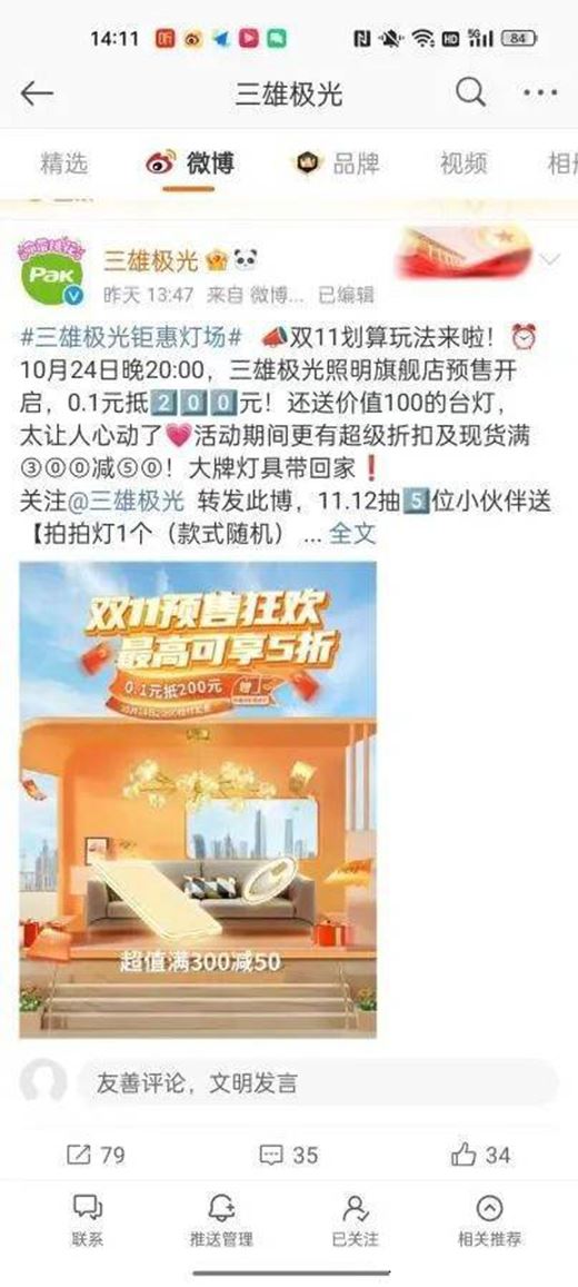 10月24日,三雄極光在官方微博發出雙十一預熱海報顯示:“0.1元抵200元,還送價值100元的臺燈,滿300減50”等活動。