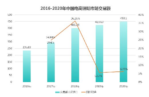 數據顯示,2016年、2017年、2018年、2019年中國電商照明市場交易額分別為235.83億元、294.5億元、401.29億元,423.63億元。2020年雖受疫情沖擊,但銷售額仍保持一定的增長,達到450.10億元,同比增速為6.2%。