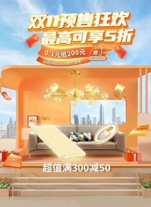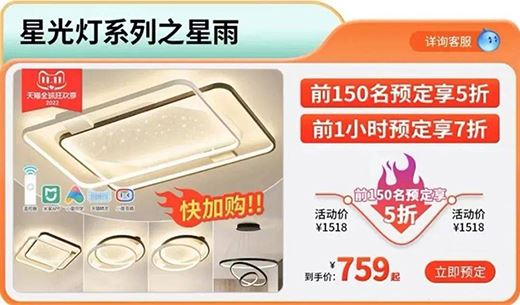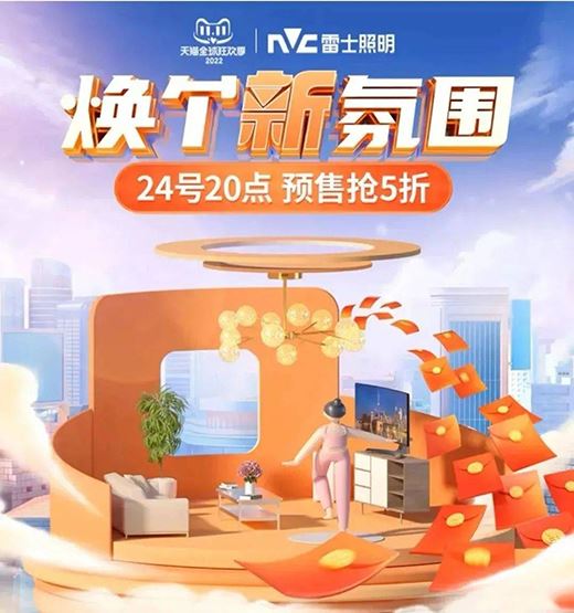 10月23日,雷士照明官微進行活動預熱,其發出的海報顯示:“雙11預售搶5折,10月24日晚8點預售開搶;解鎖星光燈,“煥個新氛圍”活動。