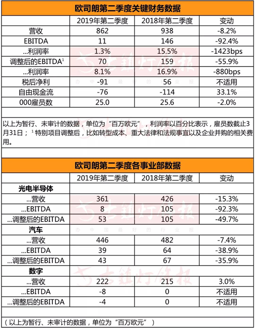 3月底,在公布初步關鍵性數據時,歐司朗曾預測第二季度銷售額將下降約15%,且調整后的EBITDA利潤率將在中高個位數范圍內。此次財報數據正如當時所預測,下降的部分原因是汽車,普通照明和移動設備市場的持續疲軟,這導致了高庫存水平,特別是在中國。此外,整體經濟放緩對業務發展產生不利影響。
