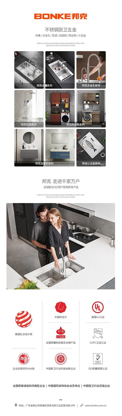 邦克廚衛將智能化、品質化、健康化的理念融入智能廚衛產品的設計當中,推出了一系列高顏值、智能化、極具個性的不銹鋼廚衛產品,包括水易凈系列水槽、梵拉智能觸控龍頭、水觸媒智能水槽、洗杯器手工水槽、小蠻腰水龍頭等產品。