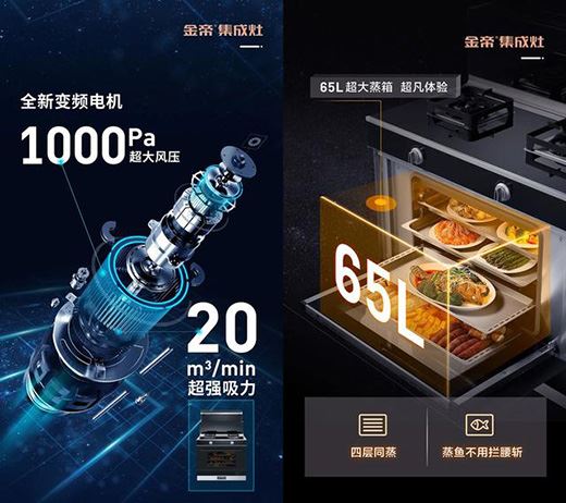 這是一個全力布局產品、精研廚房場景的新機遇,隨著金帝智能集成廚房產業園的全面啟動,新一輪高品質集成廚電產品生產也正式開啟,全系列產品將從性能、外觀等層面進行全位升級,R901ZK蒸烤一體集成灶率先亮相。超高性能變頻電機(1000Pa超大風壓、20m/min超強吸力)、65L自動激光一體弧接工藝焊接內膽的蒸烤箱,搭配燃卡脫脂蒸、雙管變頻烤、皇冠免清洗技術等全新的功能,金帝再次開啟產品新范式。